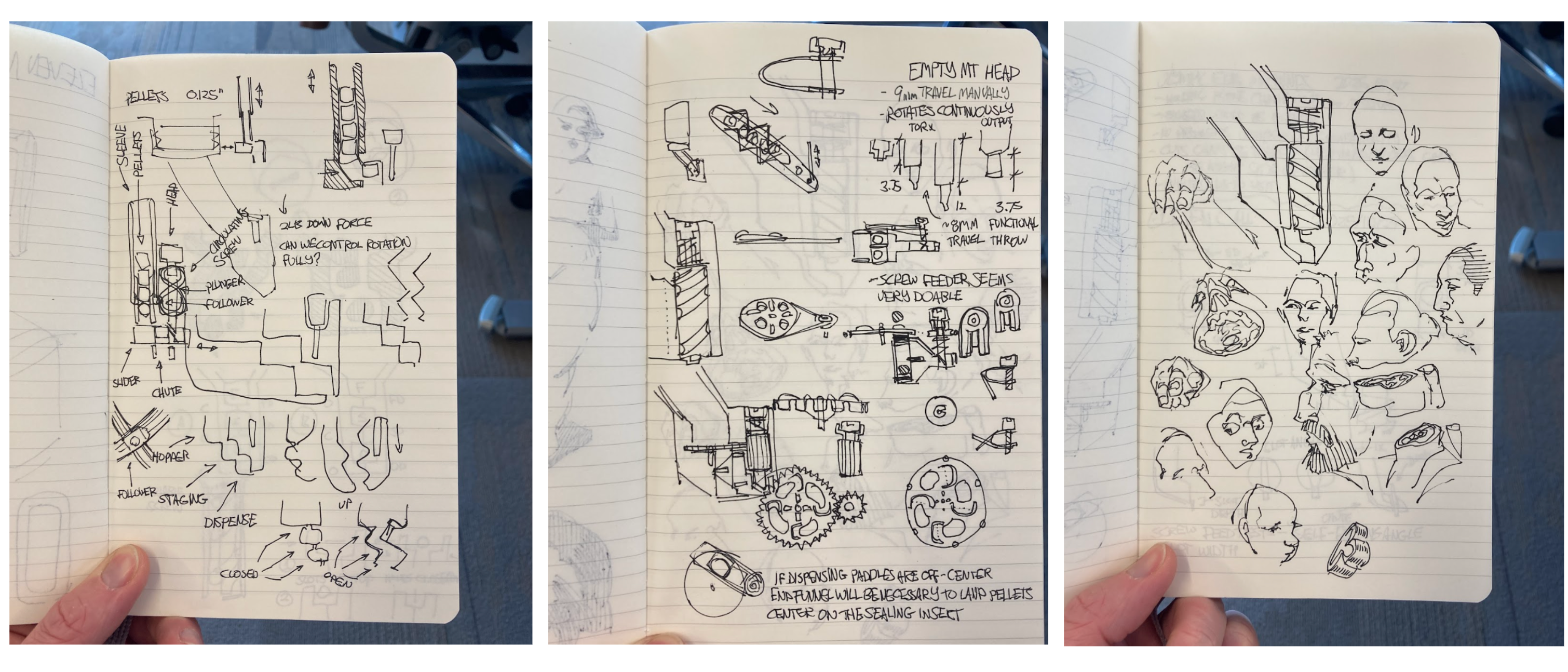All along the way, iterative prototyping moved the learnings along. This started with lots of sketches for how the dispenser might work. In these examples, you can see a number of alternatives that were abandoned because they required one-pellet-at-a-time movement. Research like the histogram revealed that there was just too much variability in pellet shapes and sizes, and ultimately underscored the importance of the screw option, which doesn’t require a clear distinction between where one pellet stops and the next begins.