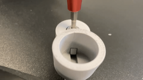 The Mettler Toledo system offers a very small space to work in. There’s a tiny T6 driver (like a screwdriver) that turns to drive the dispenser head that has been inserted into the scale. All of the mechanisms need to fit in the ~40mm vertical space between the driver and the top of the scale's inlet and the ~18mm horizontal space between its mechanical interlocks.