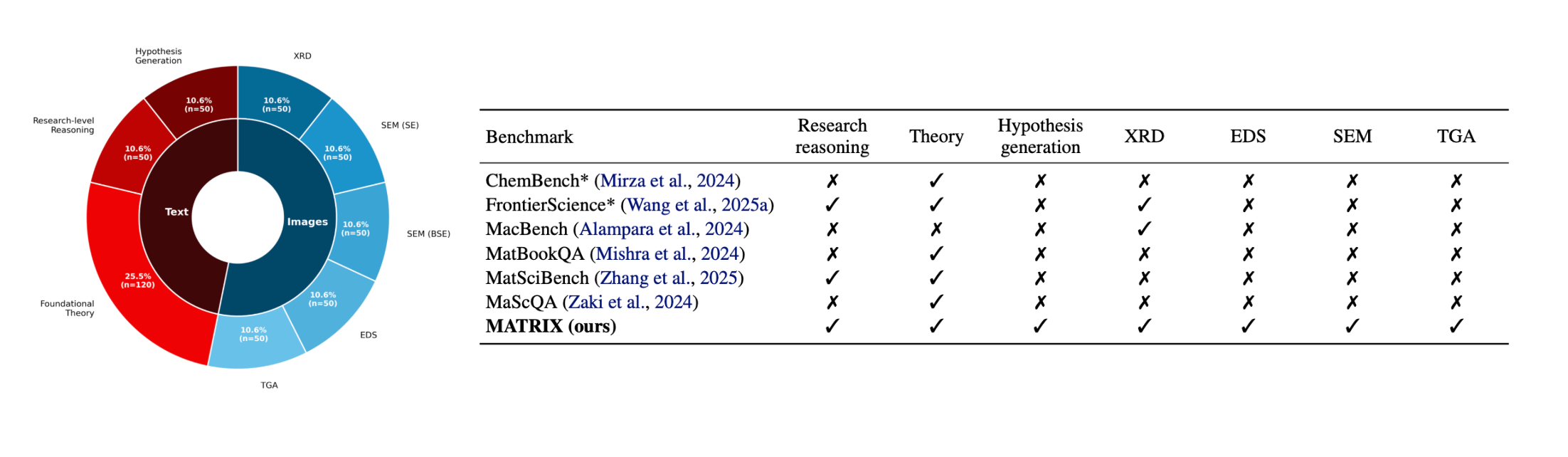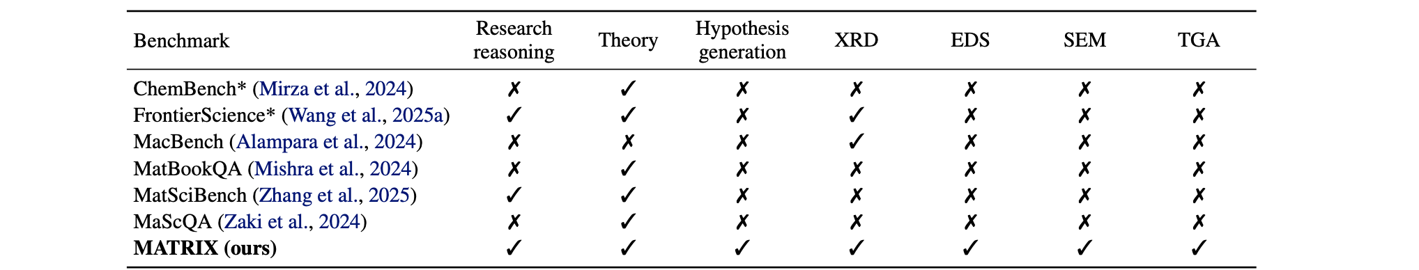 MATRIX is intended to fill this gap, serving as a multimodal benchmark for materials science reasoning that evaluates both text-only scientific reasoning and the interpretation of real experimental artifacts, inside one unified framework.