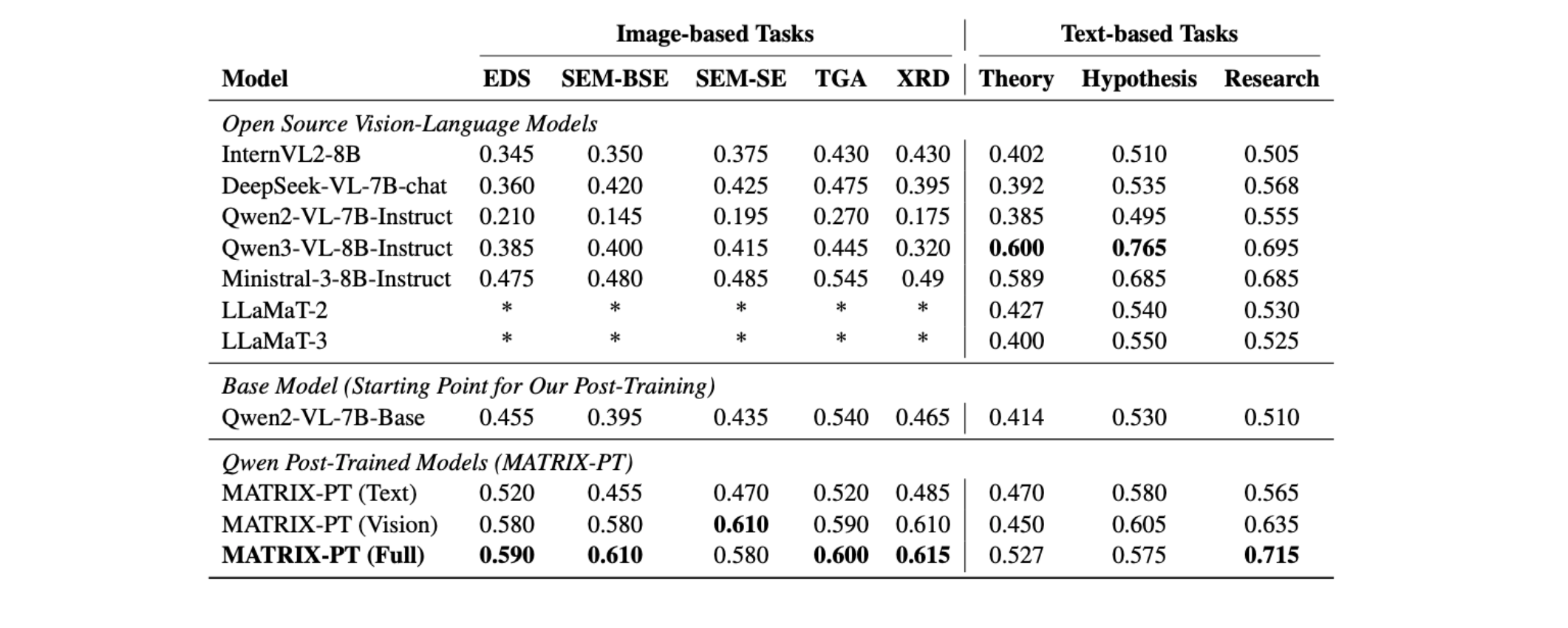 1. We introduce MATRIX, a multimodal benchmark for scientific reasoning in materials science and its corresponding MATRIX-PT post-training dataset.
